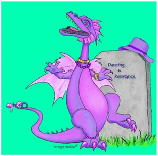 So just as I’m asking myself for the umpteenth time what I’m gonna do about it (or even what I can do about it beyond what I’m already doing, which is everything my limited physical and financial abilities can manage), just when I’m feeling frustrated and stymied again, my amazing artist friend @maggiemetcalf sends me “Cassandra the Dancing Dragon” as an early birthday present reminder that dancing – a rhythmic form of bug stomping – is an excellent form of resistance. She’s right, of course. Cassandra’s timely arrival, surely cosmically facilitated, tells me that dragons need and want to be part of the resistance, too, to remind us that we need both joy and resilience in the fight. She also reminds me that dragons eat apocalyptic horse riders for lunch, so she’ll be quite handy to have around.